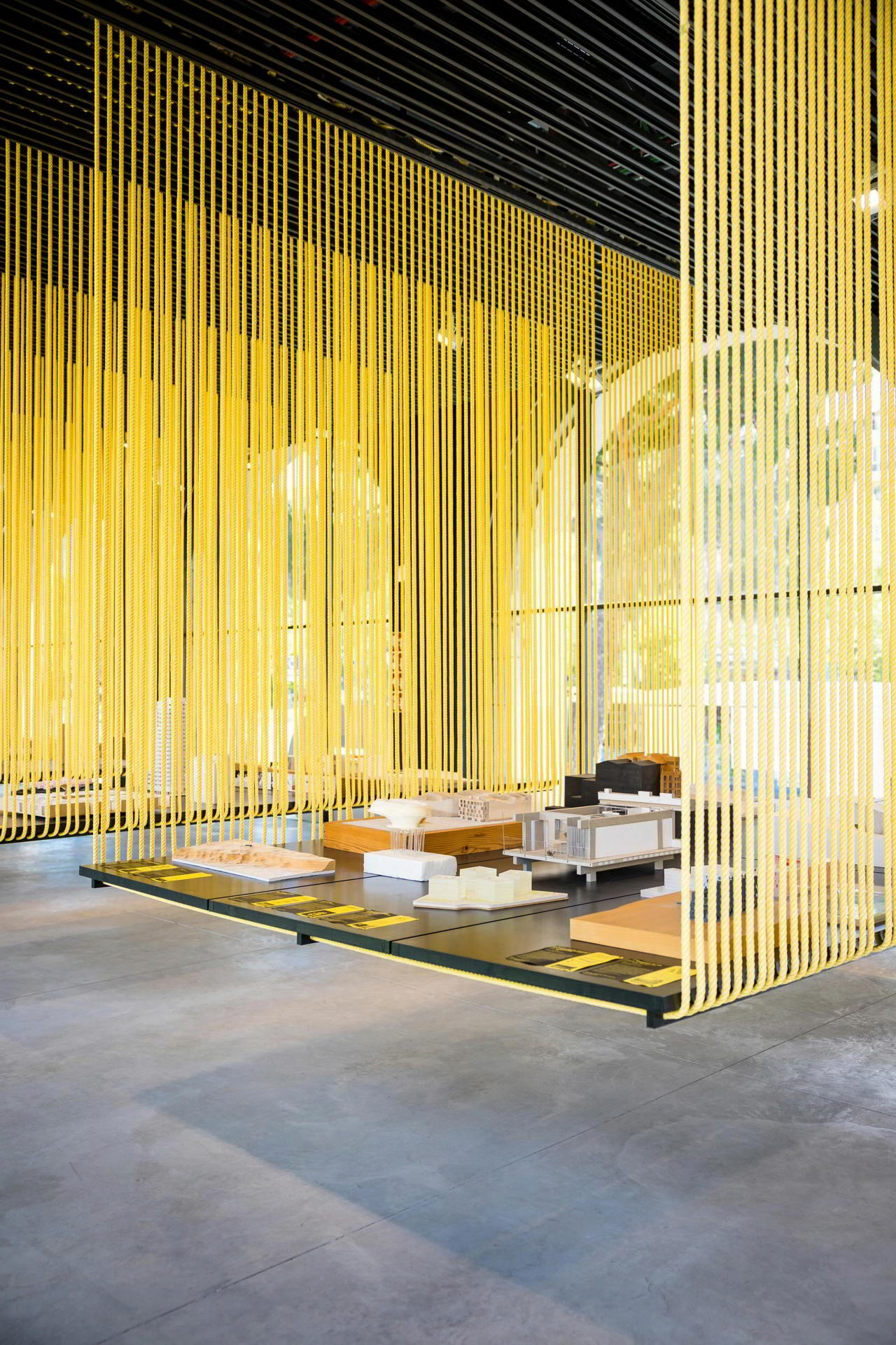 In the main room, the models are displayed in groups on a large ribbon that forms a kind of suspended table or collective swing, designed by clarasolamorales studio, to emphasize that the buildings, however individual they may be, all hang from the same thread.