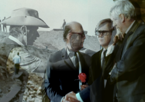 The Aswan High Dam also became a site of the propaganda apparatus of Egypt (from 1958 to 1971 known as The United Arab Republic, UAR) and the USSR, which governed the ways in which the dam was depicted in film and literature, such as in the works of Youssef Chahine and Sonallah Ibrahim. The Chahine Mobile and Posters (2019) compare scenes in the various versions of the film directed by the Egyptian film director Youssef Chahine and commissioned as the first UAR and USSR co-production to promote the construction of the dam. Inspired by the kinetic sculptures of Alexander Calder, the mobile is an abstraction of the various elements of each of the three versions of the film, suspended in the air and changing configurations triggered by the blowing of a Soviet fan – representing the propaganda and censorship apparatus governing the editing processes. The Sonallah Model (2020) in the small gallery refers to the Egyptian Marxist writer and former political prisoner Sonallah Ibrahim and his literary works based on his stay on the construction site.