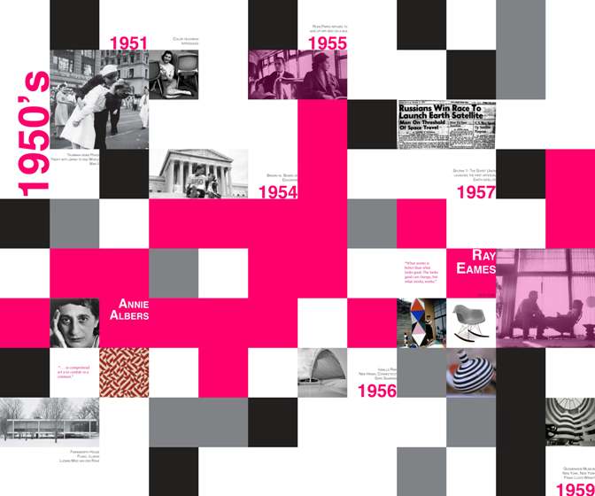 The committee is collaborating with the Burdette Keeland Jr Design Exploration Center to create the exhibit’s main feature, a 118-foot long three-dimensional timeline. The timeline’s design is a pixelated field of block forms based on a 6”x6” grid. The forms will be fabricated of plywood, acrylic, foam core, and other materials with printed images and text. Each component of the grid will be pushed or pulled away from the wall to activate space and interaction with the information. Conceptualizing the “line” as a three dimensional grid creates opportunity to see history from a new perspective.