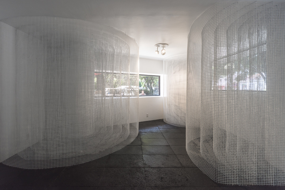 Spreading this net, the Monterrey architects S-AR were caught up in it and accepted the challenge of a simultaneous intervention at LIGA and at Monoambiente. To achieve this, the members of S-AR propose not an isolated piece, but a strategy applicable to each of the two spaces, and topologically equivalent in both cases. The connection is also established through the material—steel mesh—and in counterpoint, since the steel is left raw in one space and painted white in the other. While in LIGA the work runs around the perimeter of the space with its three columns, wrapping it from inside in successive, see-through layers, in Monoambiente a single, imaginary, central column rises.