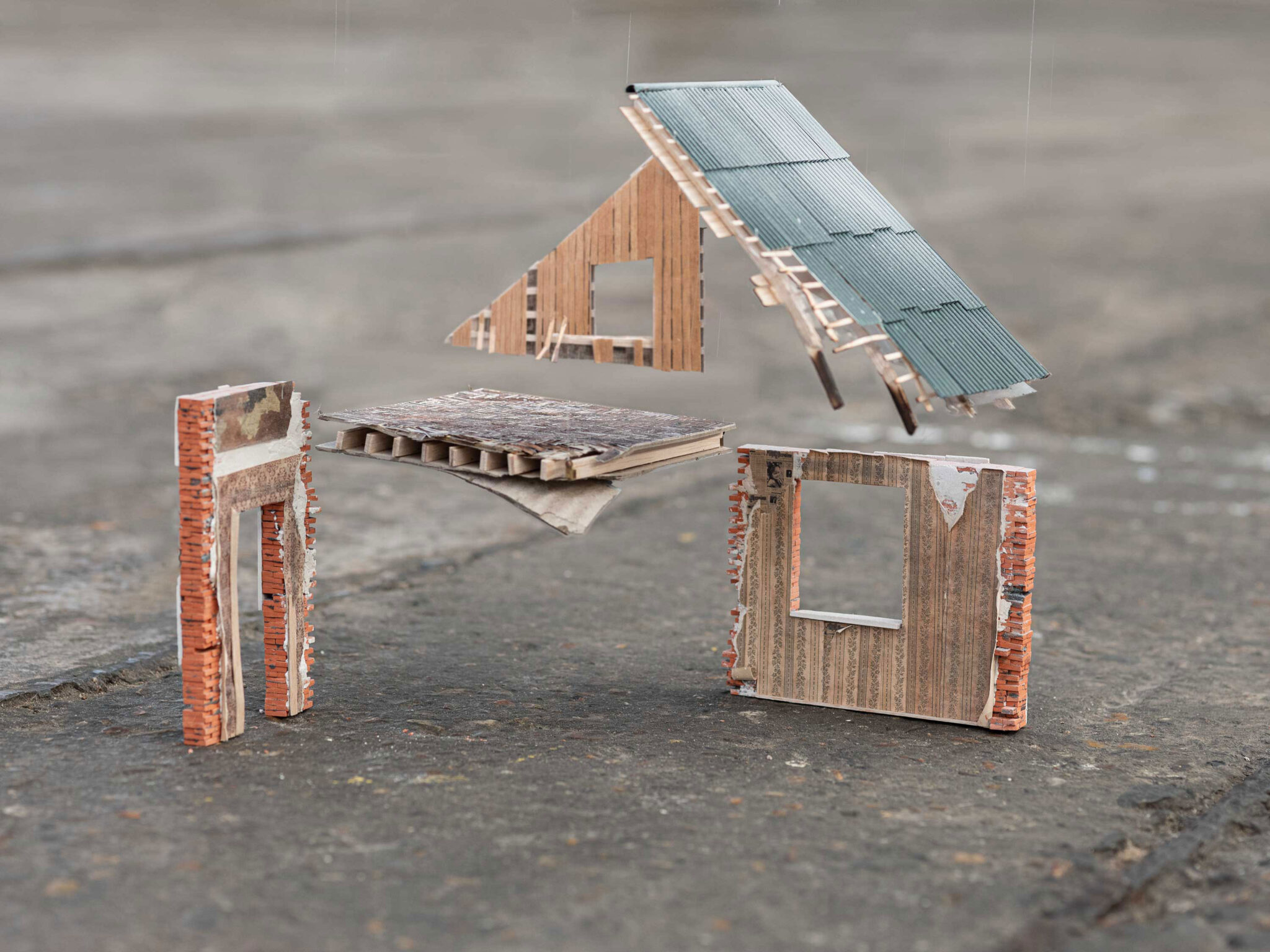 The models are based on both completed projects (on view at the Fenix Museum in Rotterdam, the M17 Art Center in Kyiv, and the Dordrechts Museum) and future full-scale installations. They are miniature echoes of places that once existed or will be recreated on a human scale. Each model bears the burden of memory within its walls: houses marked by violence, loss, displacement, and silence. Crafted from therapy diaries, worn fabrics, and family heirlooms, they translate personal experiences into spatial form.
