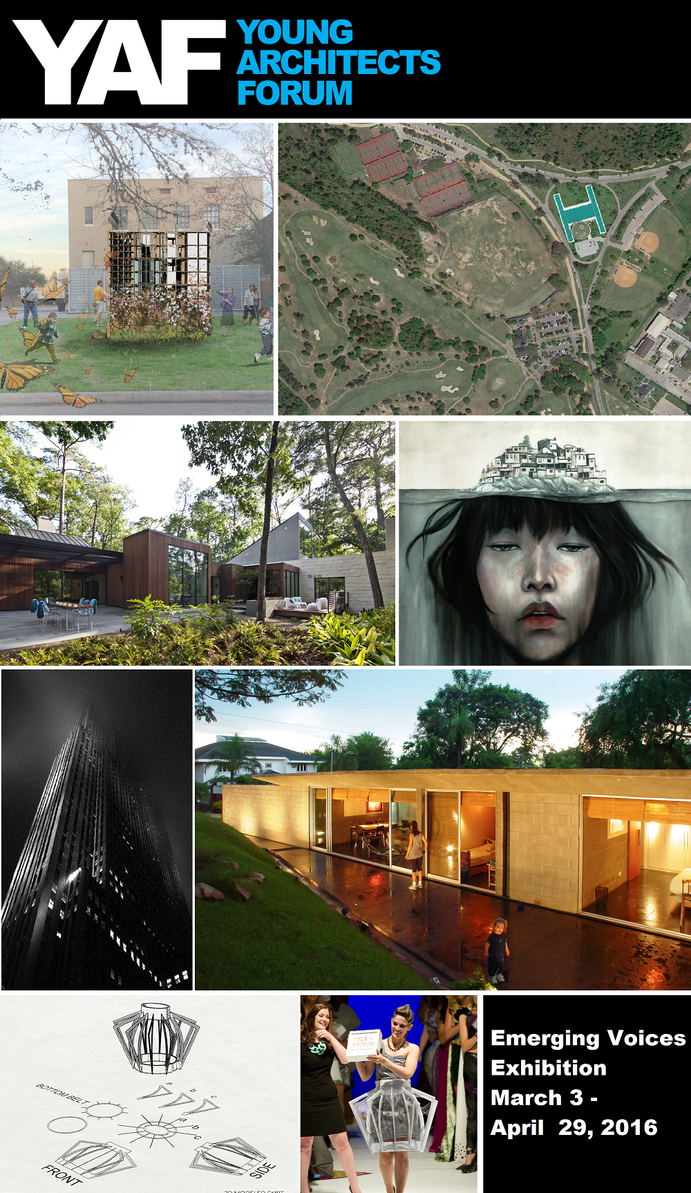 The YAF Emerging Voices Exhibition features AIA Houston members within the first 10 years of their licensure. Built and unbuilt architectural projects are exhibited along with sketches, models, photography, painting, sculpture, design and community efforts in all forms. The exhibit offers a wholistic portrait of our local emerging voices and what is both now and next in Houston.
