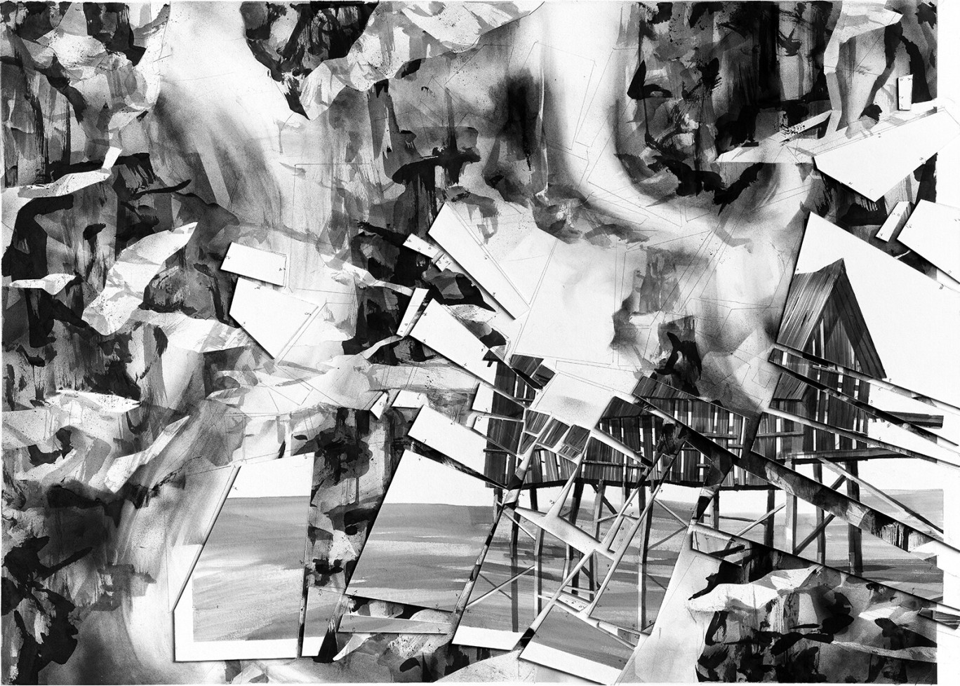 The drawings move between architecture and nature, structure and dissolution. Light, atmosphere, and fog become active components of the composition, simultaneously shaping and dematerializing the architectural elements depicted. The result is works in which depth, movement, and transparency enter into an exciting balance.