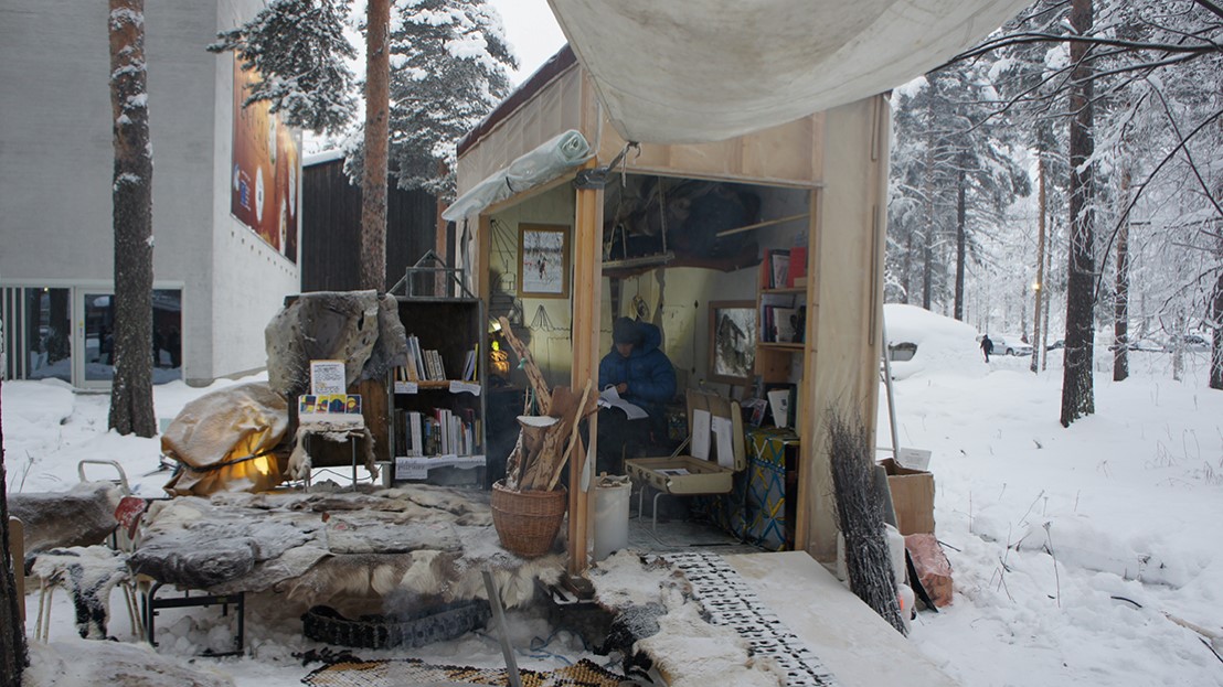 Girjegumpi is a nomadic project that changes in different situations and contexts. It was exhibited for the first time in Harstad in 2018, during the Arctic Arts Festival. It has also been exhibited at the winter market in Jokkmokk, at the National Museum of Canada, and during the Bergen International Festival. When Girjegumpi is not travelling, it is based at the Sámi Center for Contemporary Art in Karasjok.